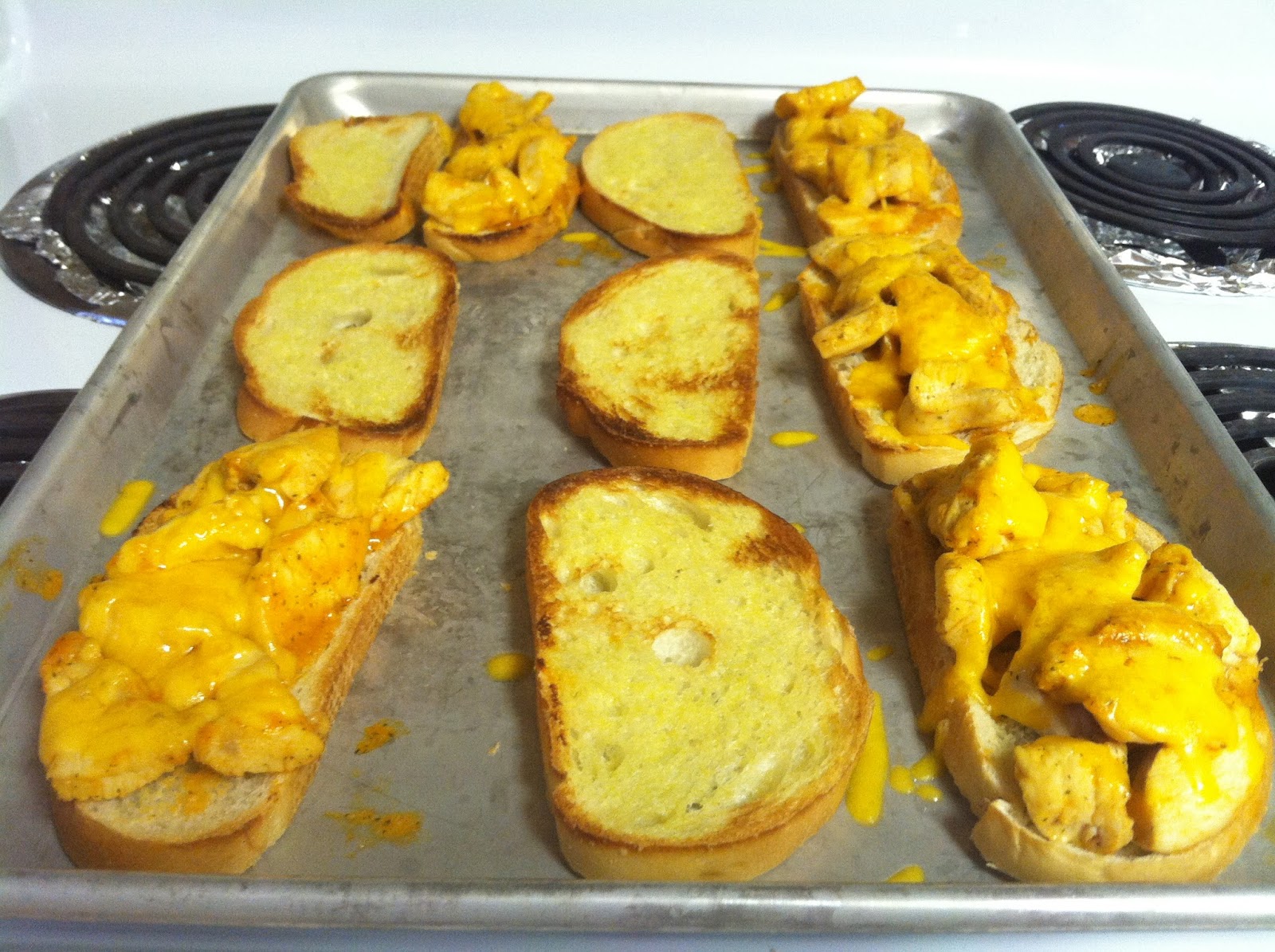 4. On a cookie sheet, lay out your bread and butter one side. Top the other side with the chicken mixture and cheese.