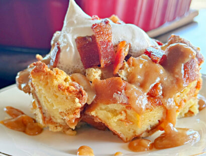 Doughnut Bread Pudding with Crispy Bacon and Caramel Drizzle