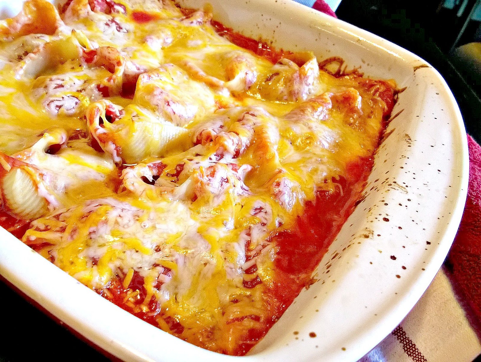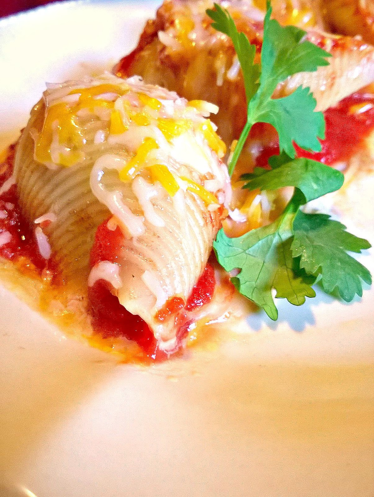 - Drizzle the remaining sauce over the shells and sprinkle the remaining cheddar cheese evenly on top.