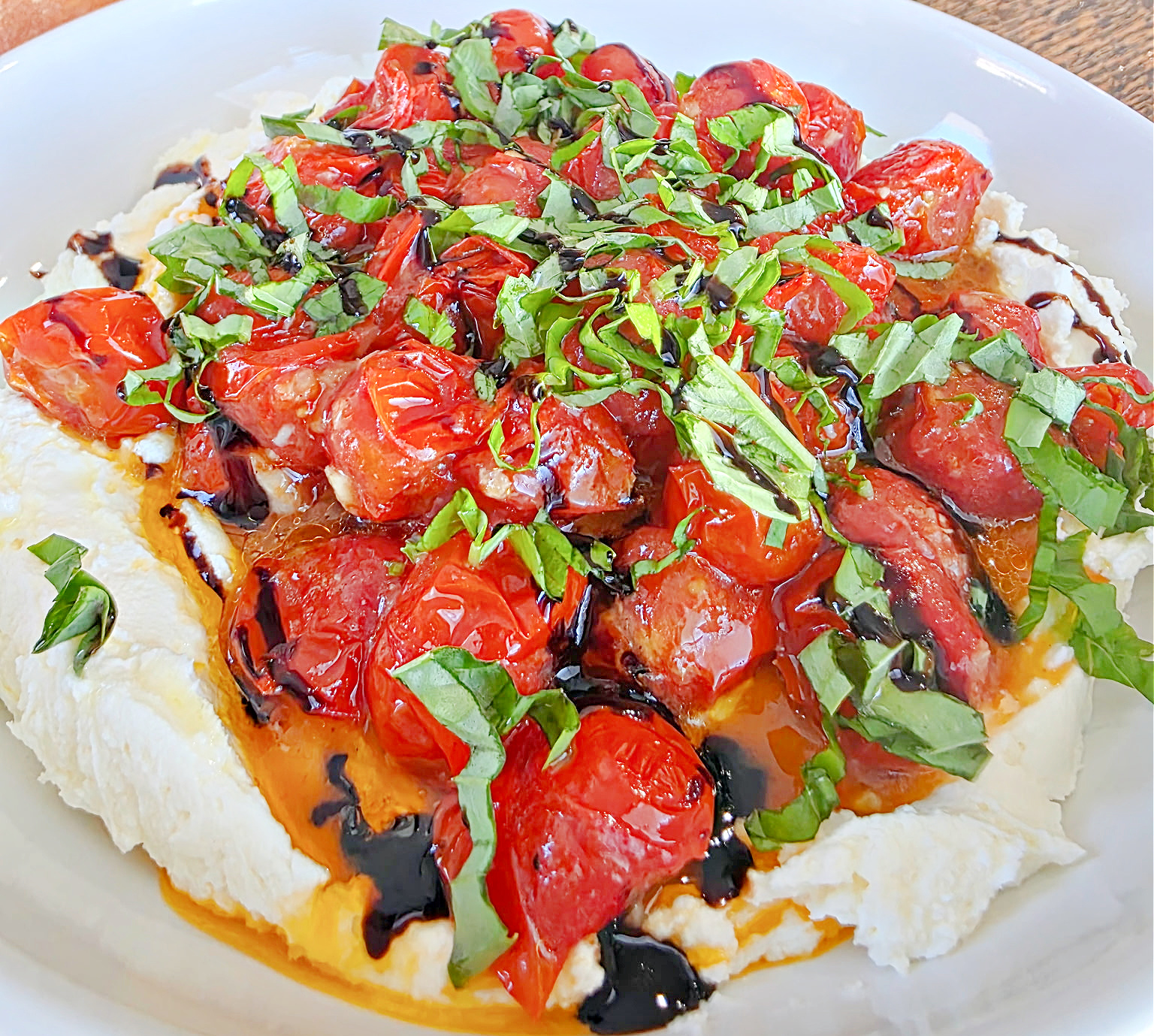 It’s rich but bright. Creamy but fresh. Savory with just enough tang to keep things interesting. It manages to feel indulgent and light at the same time, which is honestly a culinary flex. Whipped feta brings salty, creamy luxury. Greek yogurt keeps things smooth and slightly tangy. Cream cheese adds body and balance. And then—because we believe in layers—fresh tomatoes, basil, red onion, garlic, olive oil, and balsamic swoop in like, “Hey, remember summer? Remember flavor?”