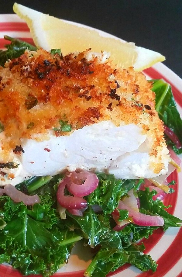 - Meanwhile, heat a large pot over medium heat. Add 3 Tablespoons olive oil, then add the red onion and cook, stirring occasionally, until lightly browned, about 5 minutes. Add the escarole, kale, 1 teaspoon salt, and pepper. Cook, stirring occasionally until the greens are wilted, about 3 minutes. Stir in the lemon juice and the remaining 1 Tablespoon parsley. Serve the fish with greens and lemon wedges.