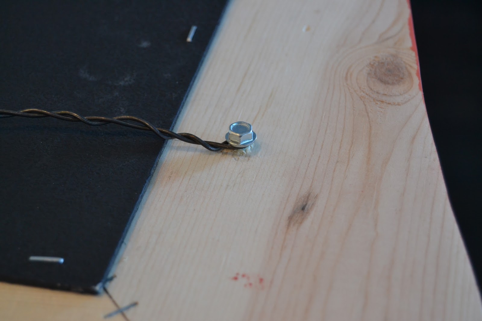 If you’re going to hang it, here’s an easy solution. Screw two small 1/2 ” screws into the outer edges of the board and wrap a wire around each.