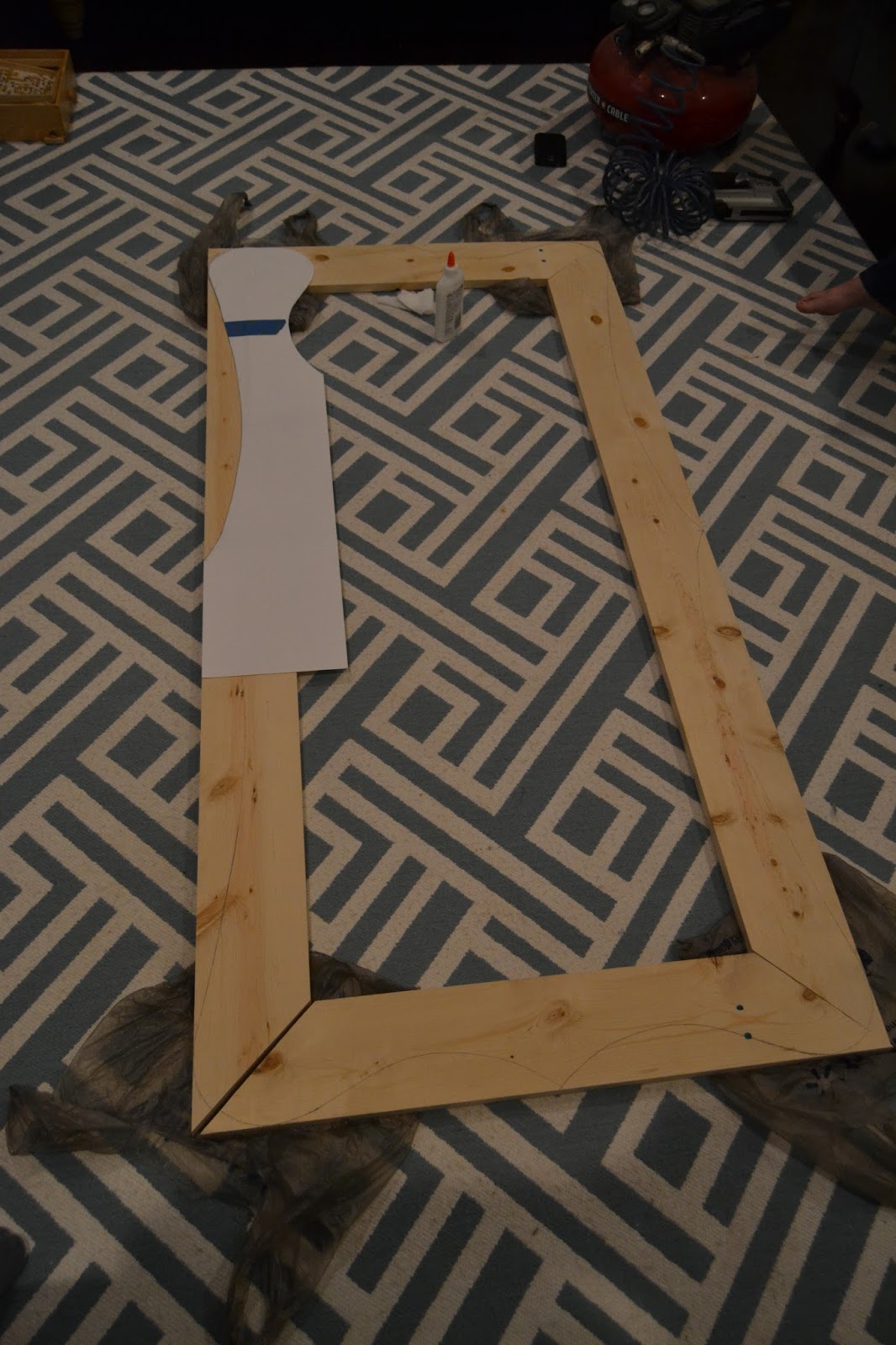 We taped the paper together that was half the length of the board. We drew the design we wanted on it, cut it out, and traced it onto the board.