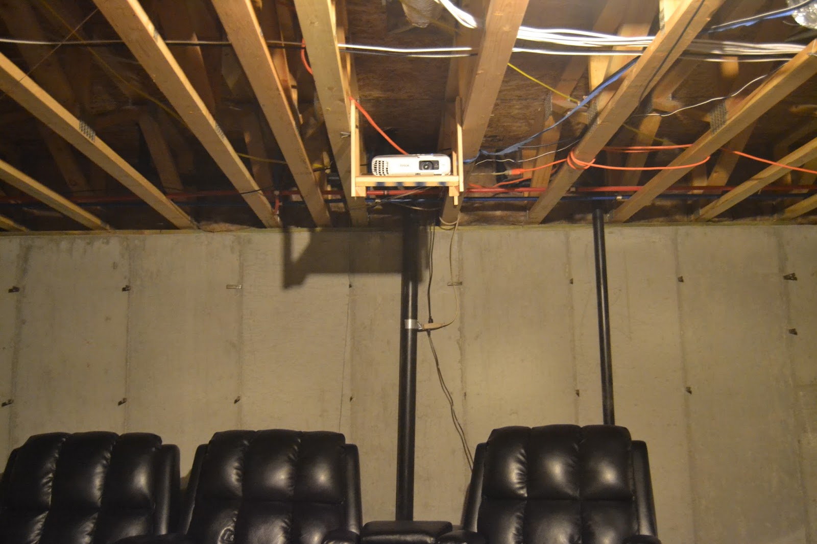 Overall, it was a pretty easy project. The screen is still just a white-painted square on the cement, and the projector is in a little box that my hubby built into the rafters. As I said, we’re not professional, and this is just meant to get your creative juices flowing, so you can create an oasis in your unfinished basement too!