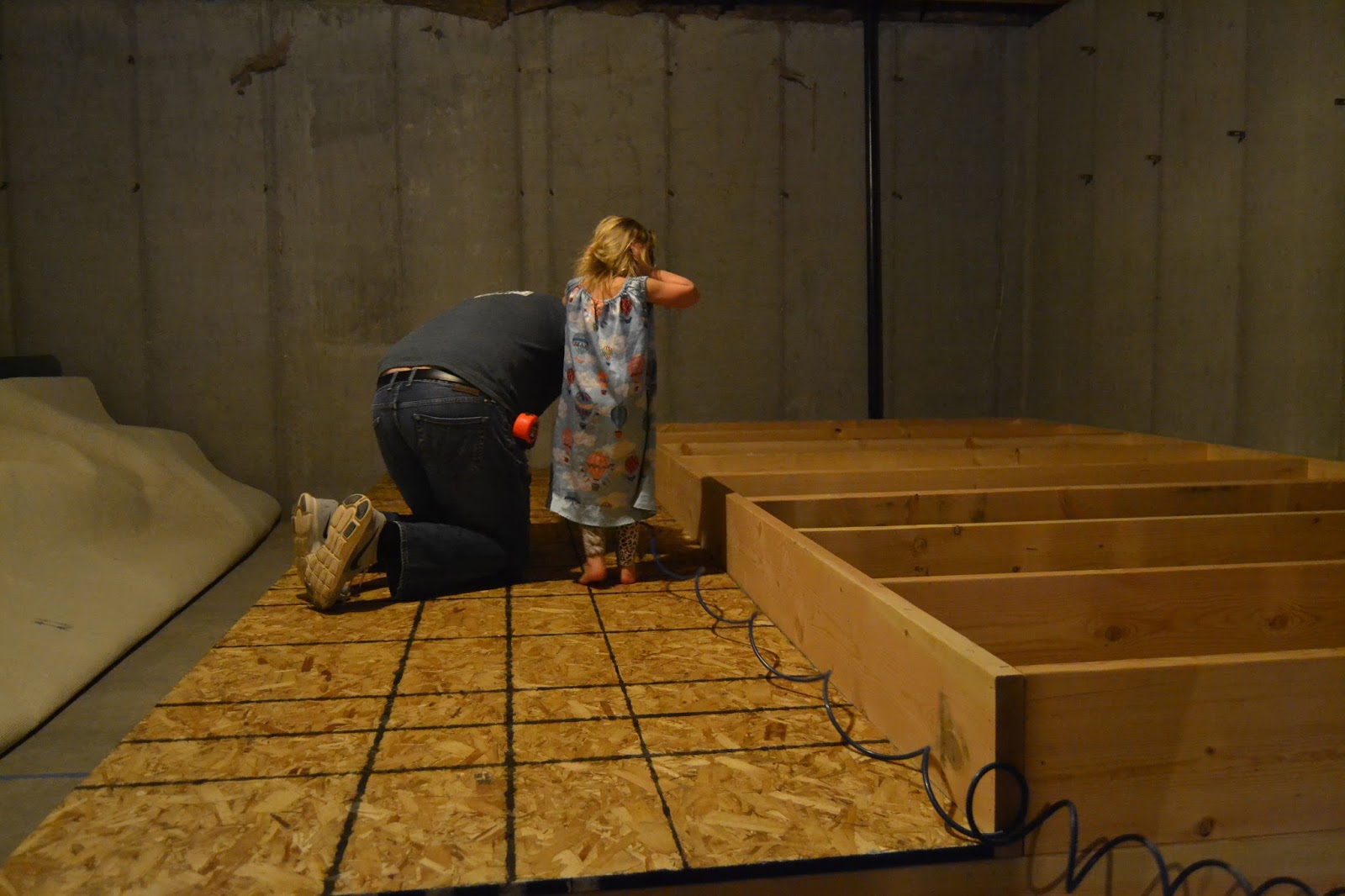 First, we had to build around the pipes in the basement. We framed the bottom box, by placing the supporting boards 2 feet apart, with supporting beams in the middle that we could use to hammer the sheets onto.