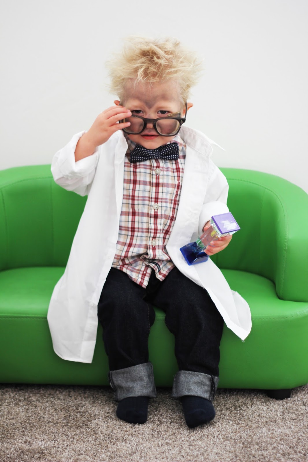 The lab coat was just an oversized white dress shirt. You can find tutorials online to make it look a little more like a lab (or doctor) coat but once I put it on him I discovered it was easy enough for people to get the picture of what he was so I just let it be!