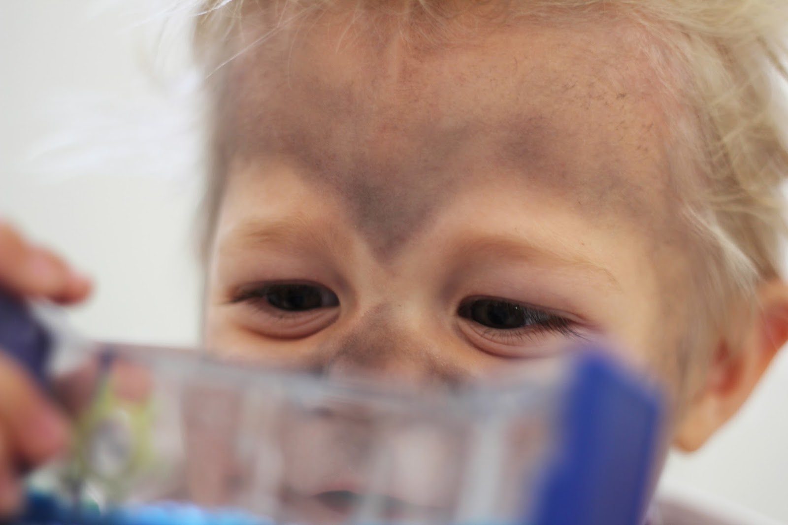 To do the “explosion marks” I just used a makeup brush and black eye shadow. For his mad scientist prop, I was going to get a chemistry flask, but I knew anything I put in it would end up straight on the floor, so I got a liquid motion tube instead. He LOVED it and wouldn’t stop saying “bubbles!!!!”