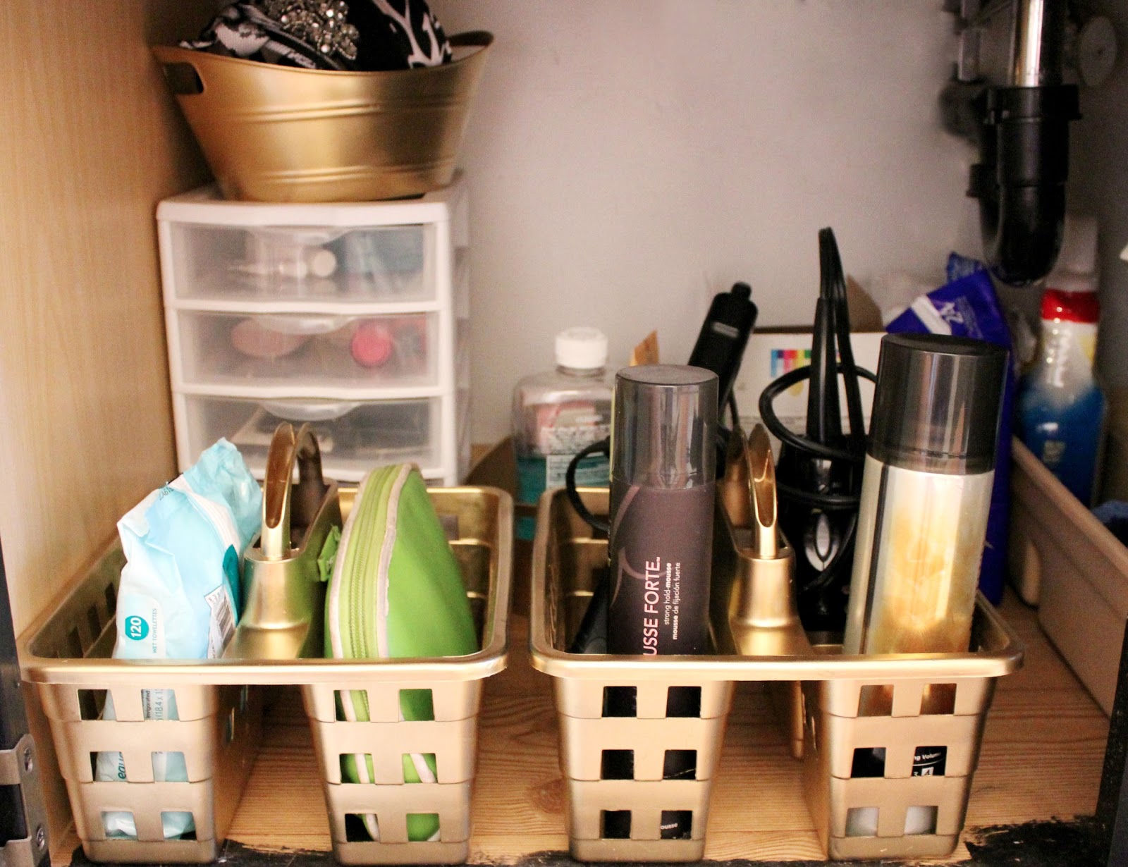 Dollar Store Makeover Bathroom Organization! Living in a small apartment, and on a small budget, makes it hard to keep anything organized. Today though, I decided that I was sick of my hair and make-up gear ending up looking like this at the bottom of my sink: