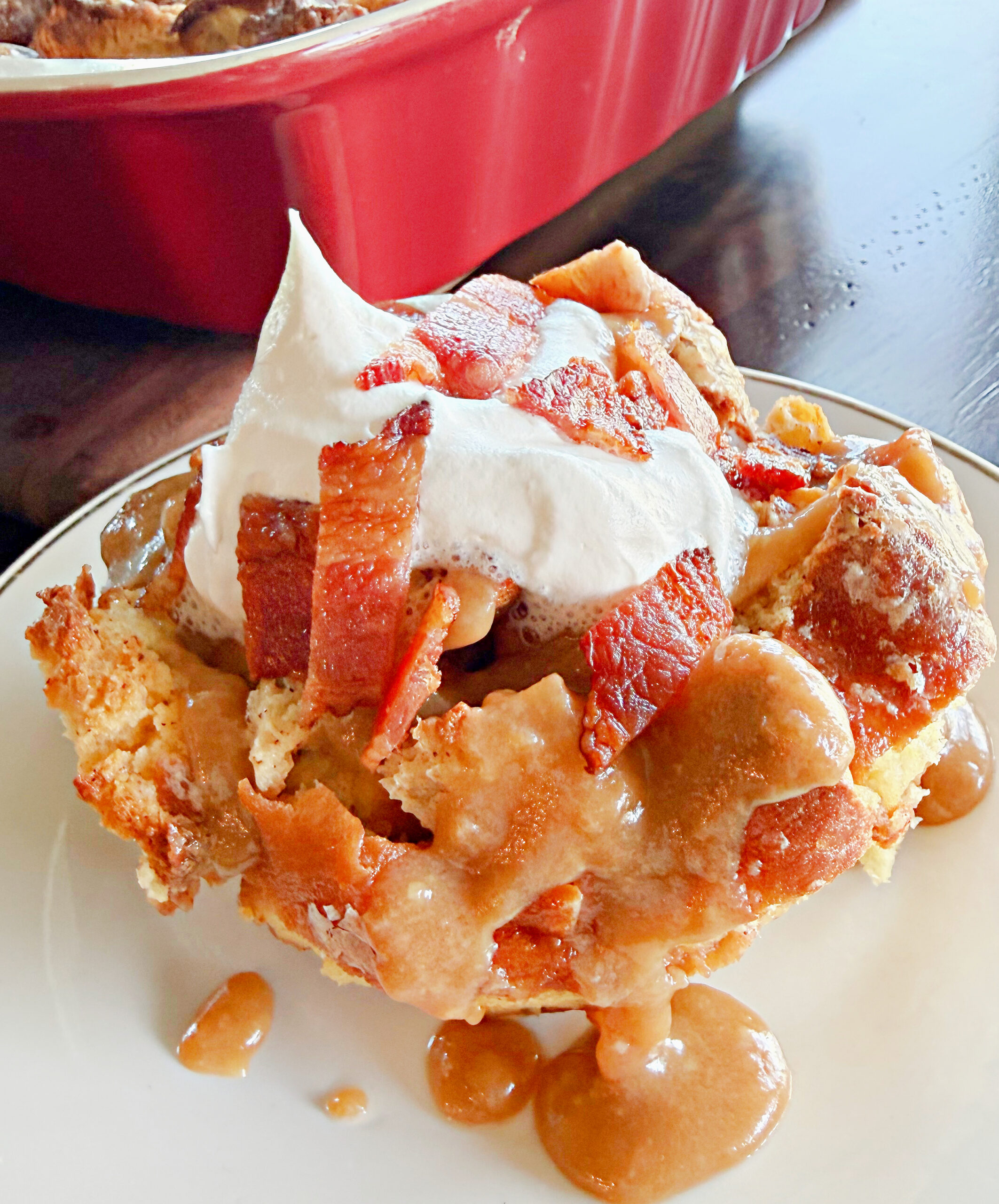 Doughnut Bread Pudding with Crispy Bacon and Caramel Drizzle