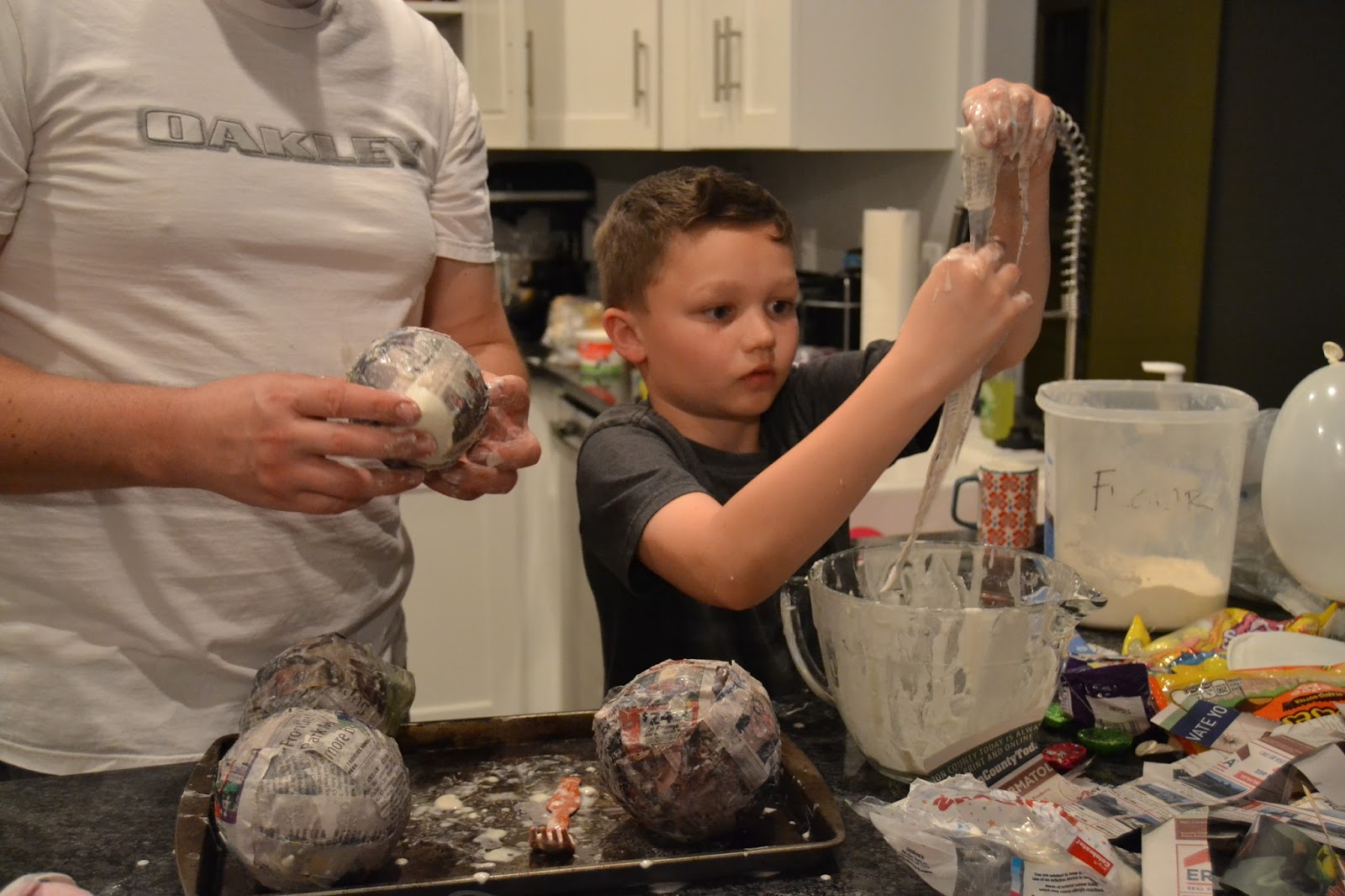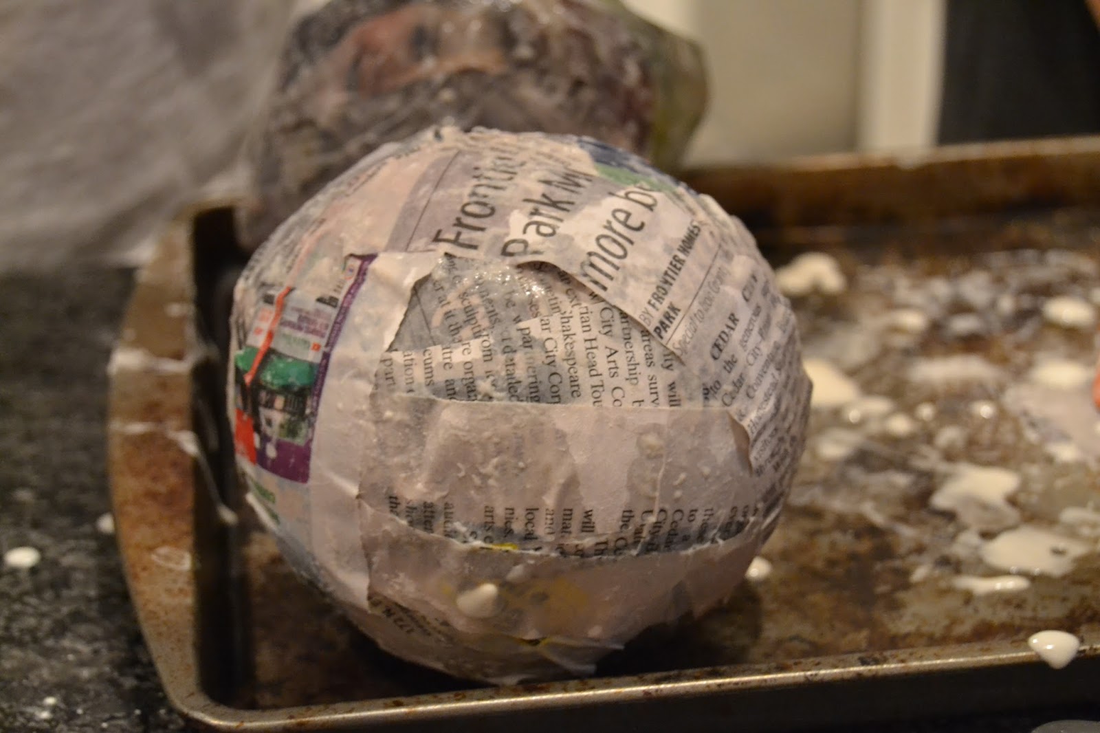 Combine your flour and water mixture with a whisk. It should make a thin paste, add water as needed. Dip strips of newspaper into the flour mixture and cover the balloons completely with one coat.