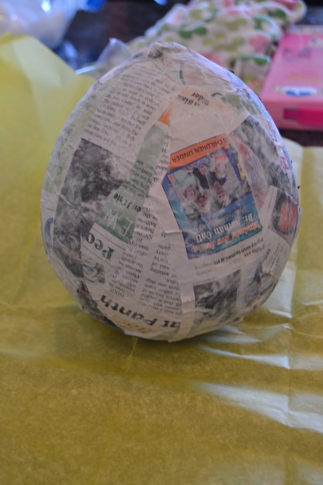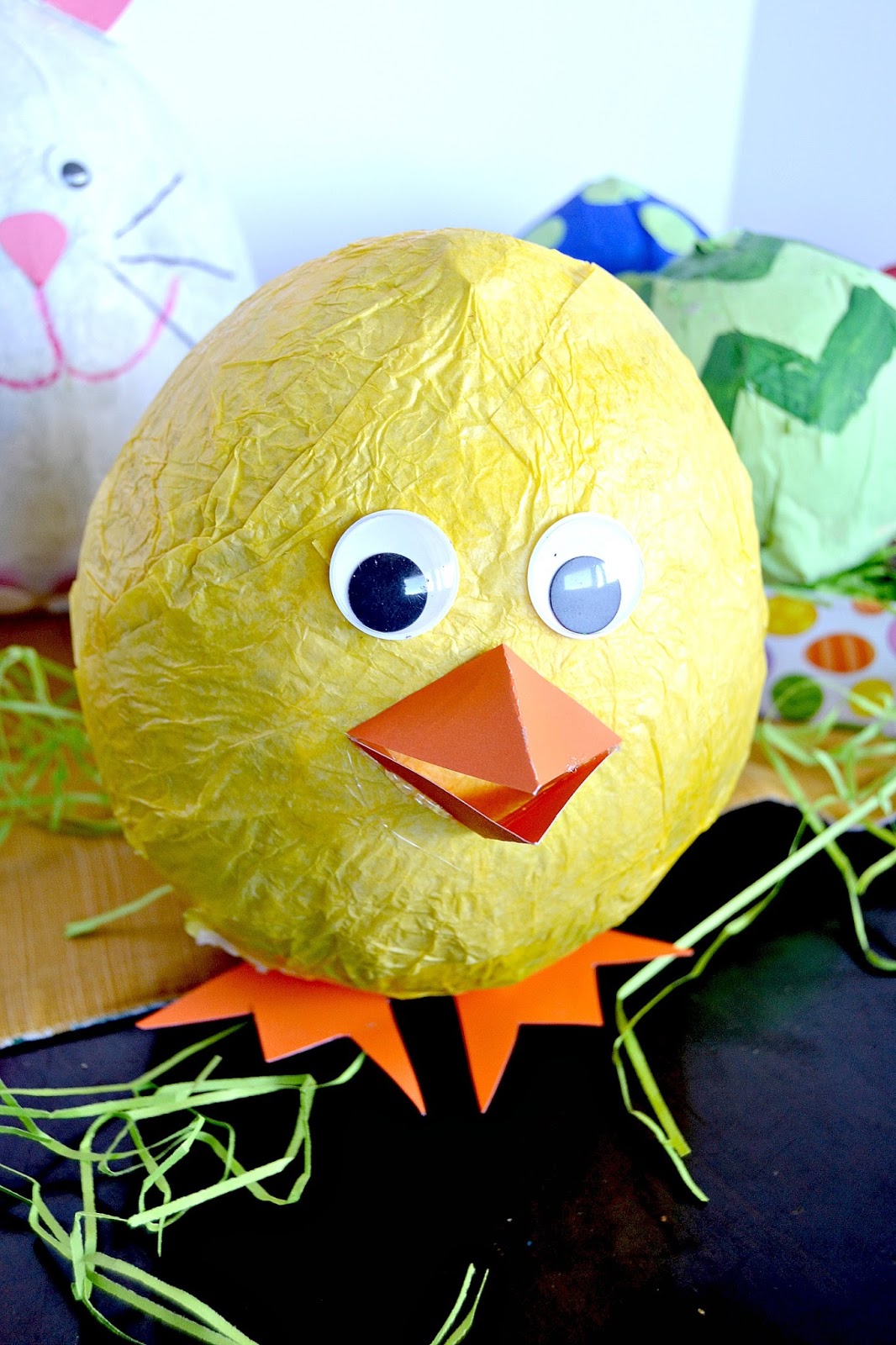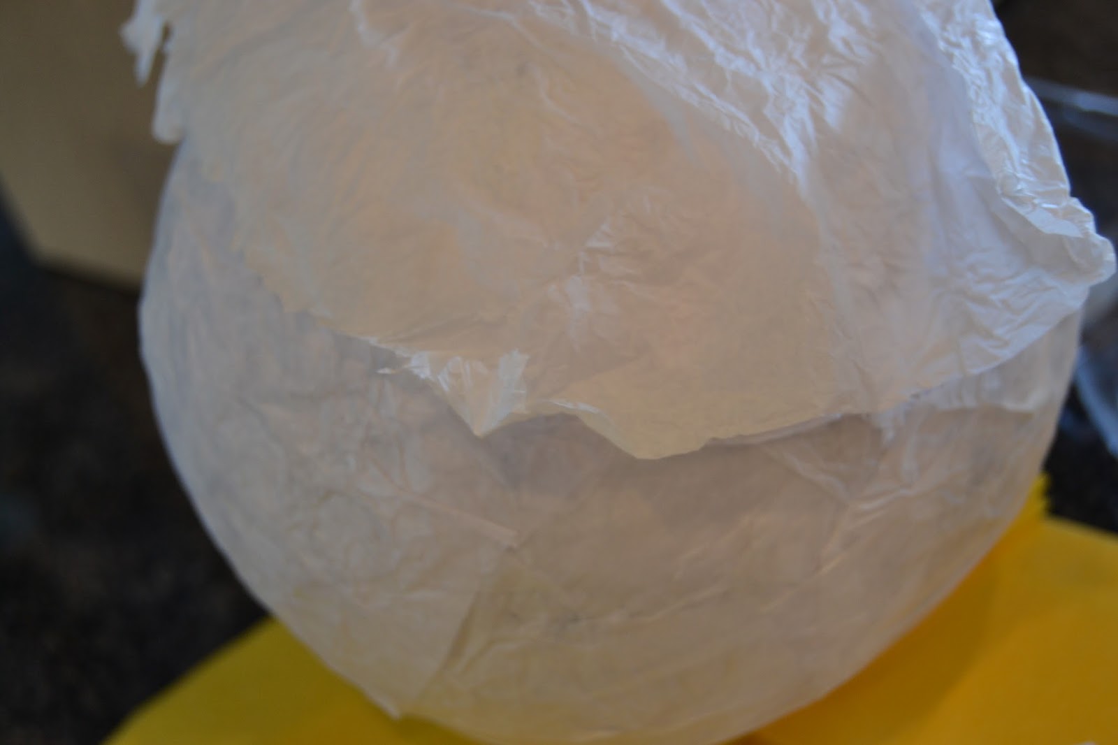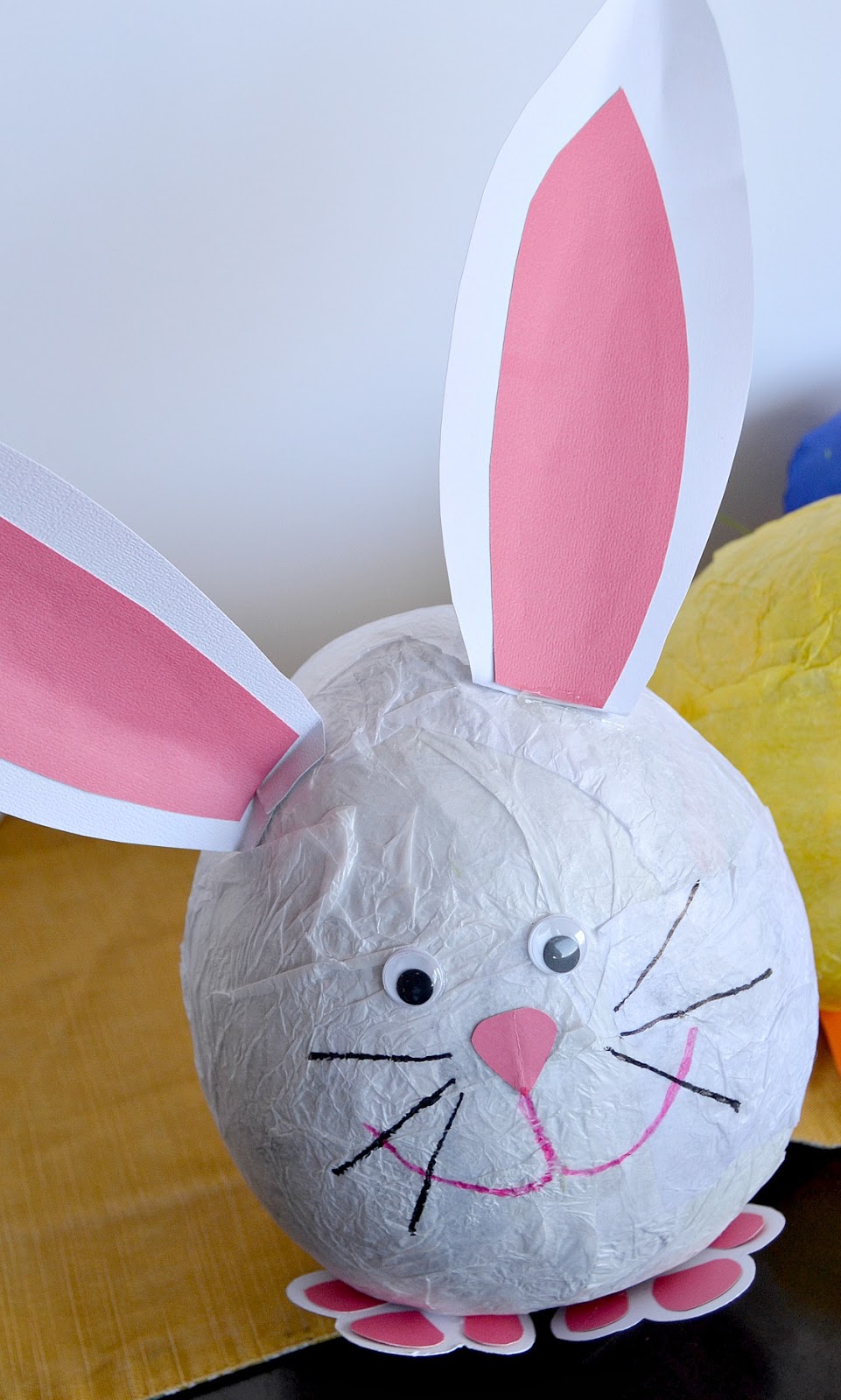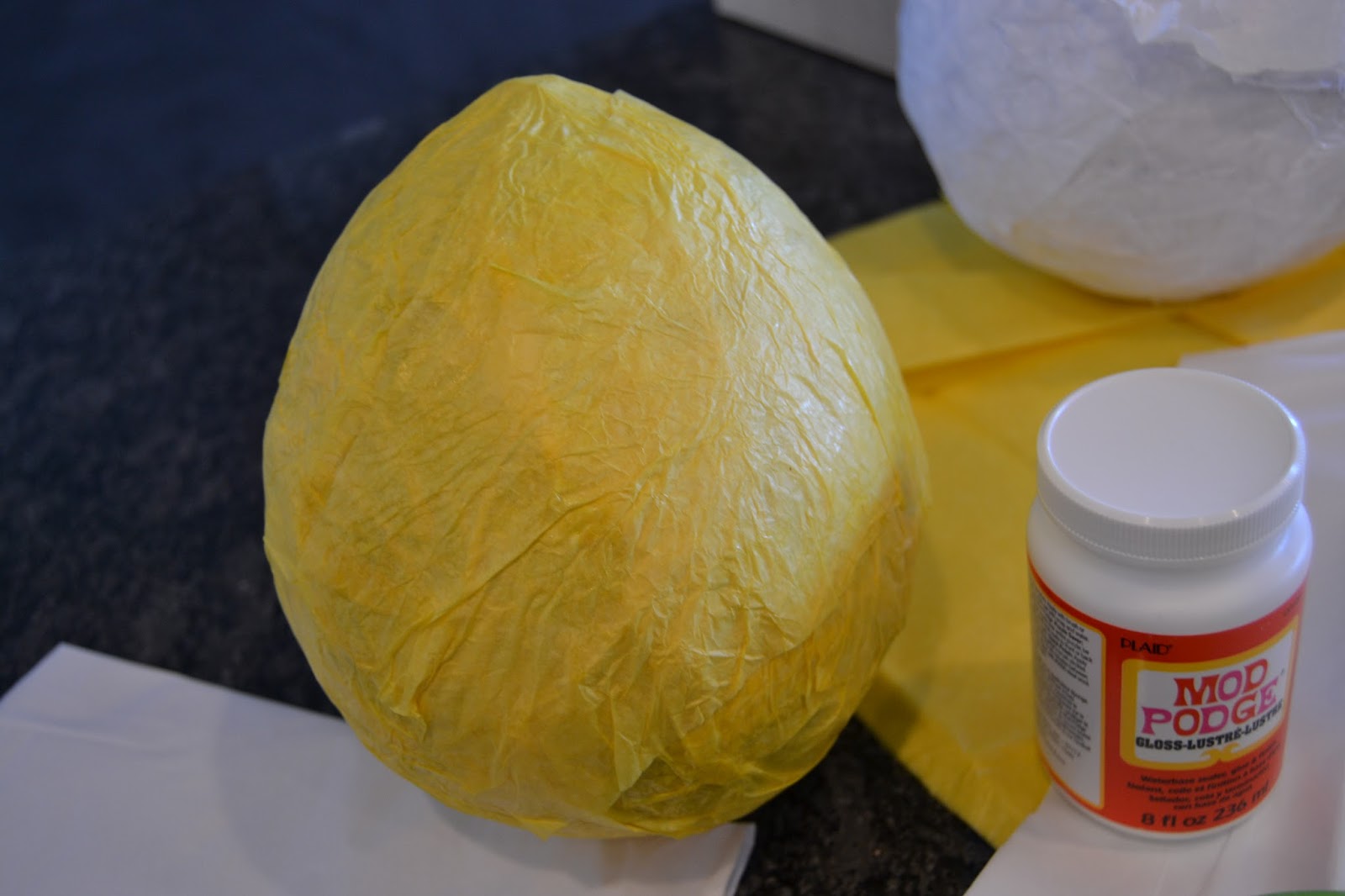 Once your balloon is dry, Mod Podge crumpled tissue paper onto your balloons. White for a bunny and yellow for a chick. You could paint them at this point. We painted our Easter Eggs and tissue papered the bunny and chick.