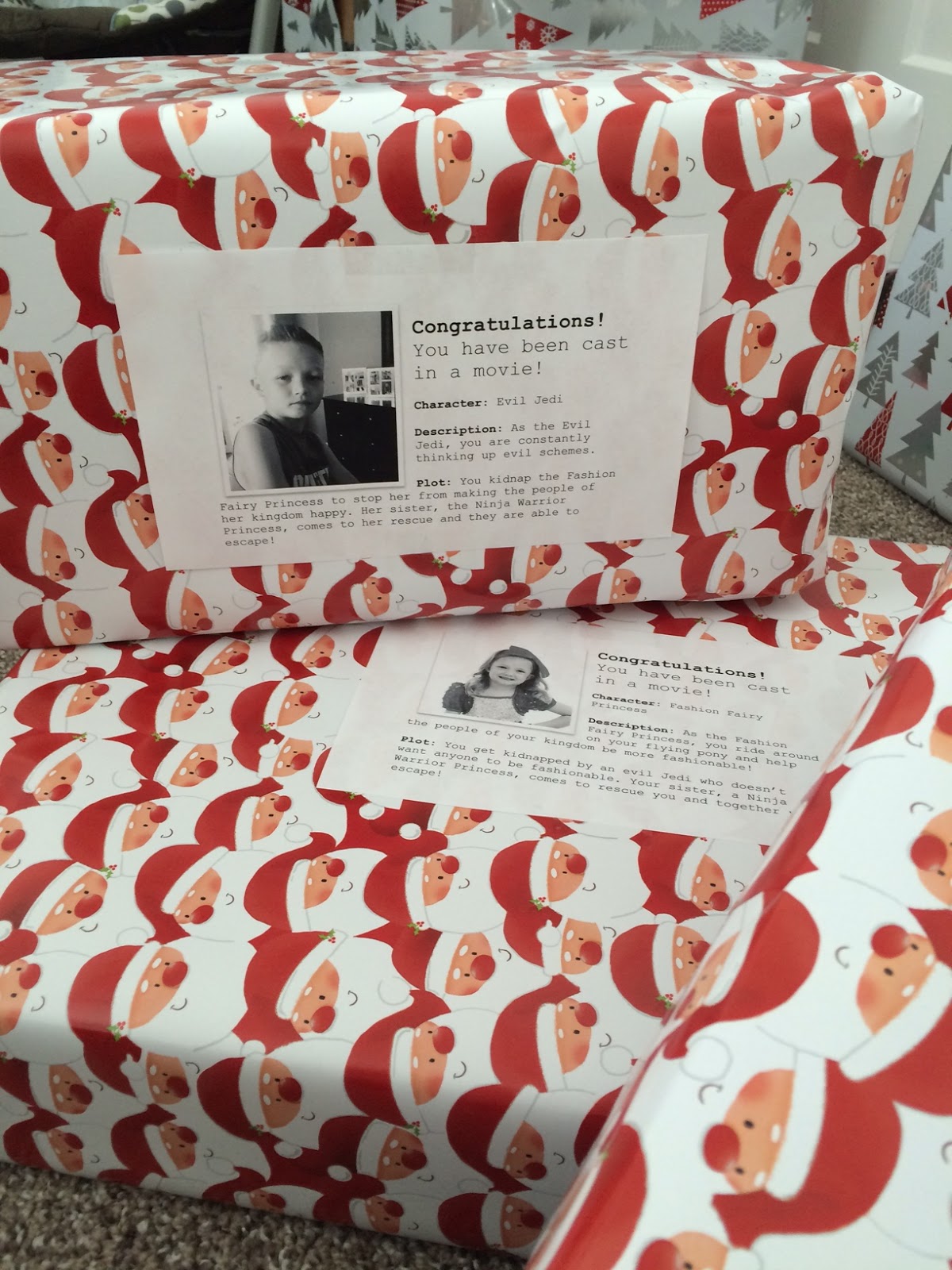 I made “casting call” tags to go on their presents that set up what it was all about. They were a little confused at first to see their pictures on their presents, but after they read what it was all about they were excited!