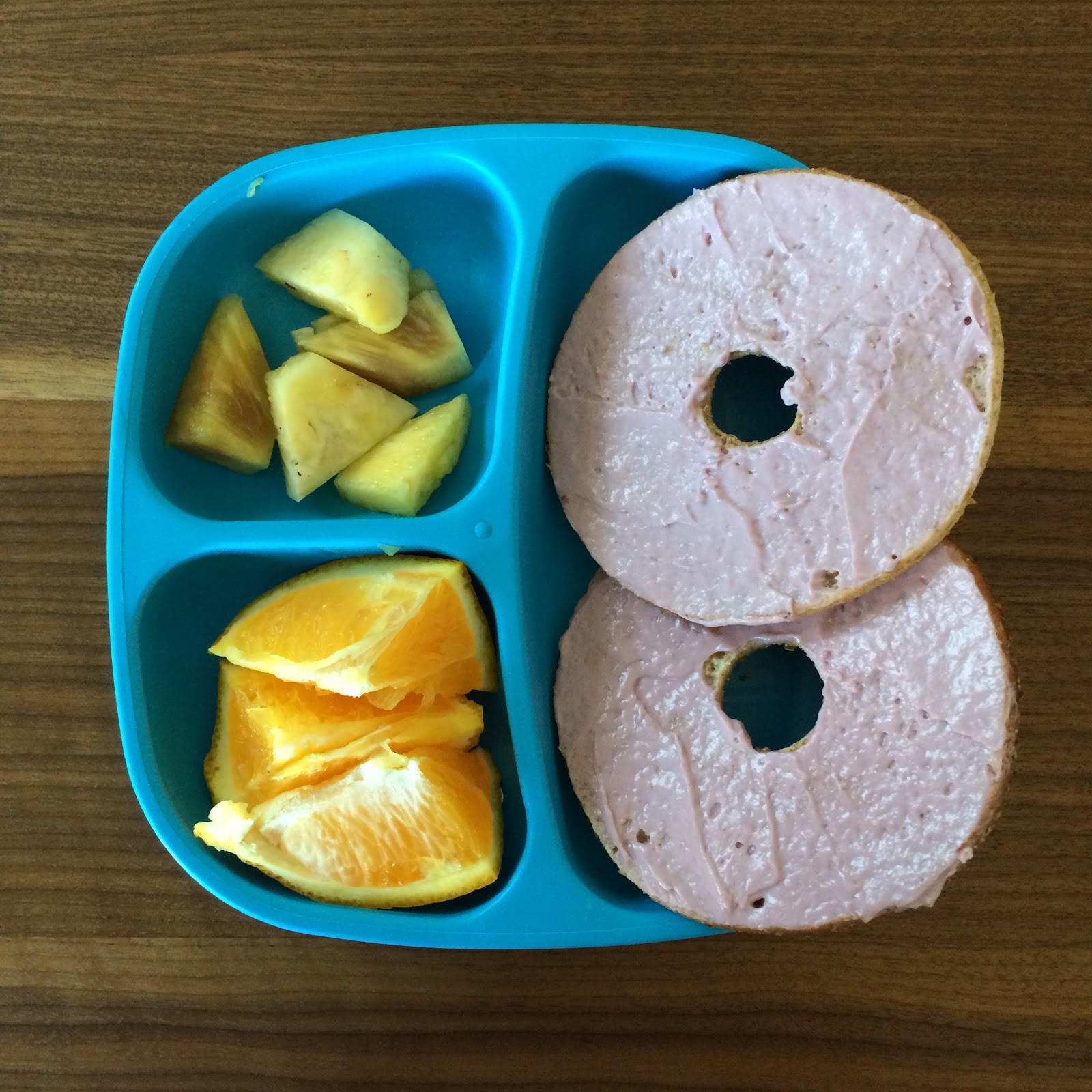 Bagel Thins and Fruit: Bagel thins are way easier for him to eat than regular-sized bagels and they make a really quick lunch in a pinch!